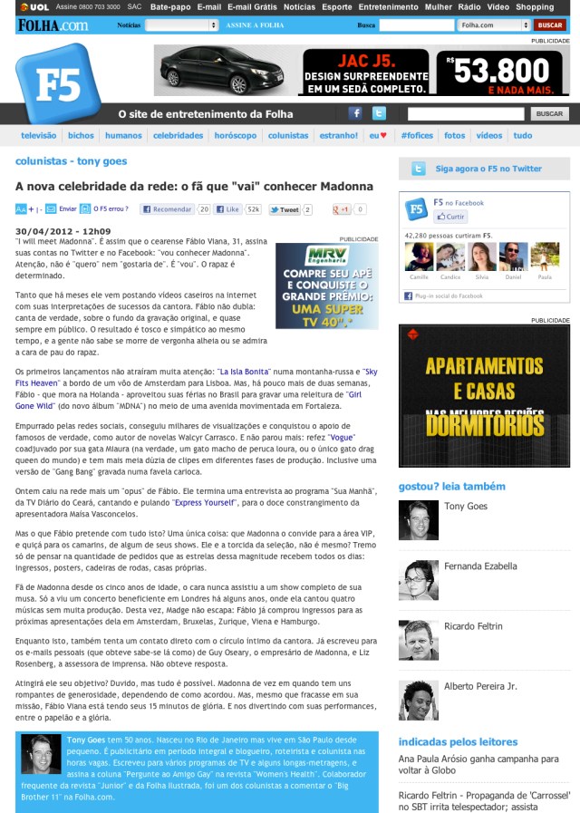 But I am not having only support from TV. Folha.com, one of the biggest Internet Portals in Brazil, also made an article talking about my journey. The writer @tonygoes called me “the new web celebrity”. Tony, I just want to meet Madonna and be part of her next videoclip!